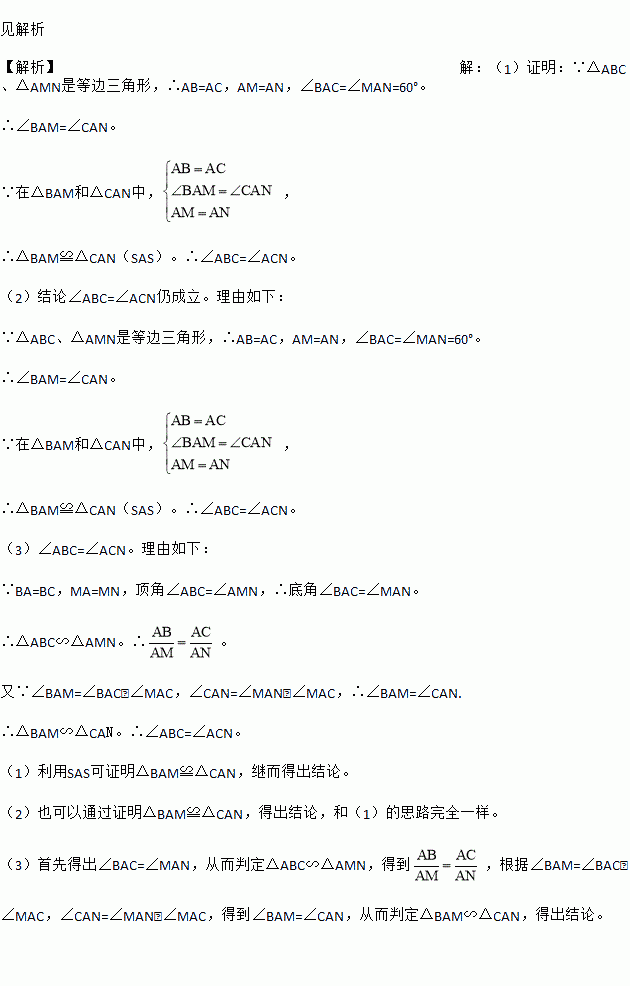 (1)如图1,在等边△ABC中,点M是BC上的任意一点(不含端点B、C),连结AM,以AM为边作等边△AMN,连结CN.求证:∠ABC=∠ACN.