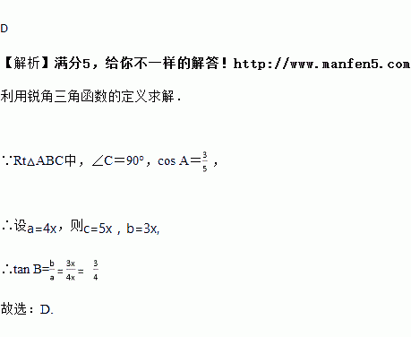 在Rt△ABC中,∠C=90°,cos A=,那么tan B=( )