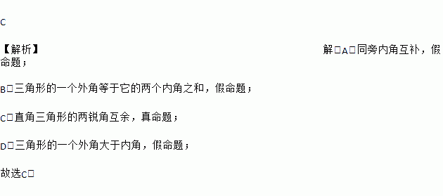 C 【解析】解:A、同旁内角互补,假命题; B、三角形的一个外角等于它的两个内角之和,假命题; C、直角三角形的两锐角互余,真命题; D、三角形的一个外角大于内角,假命题; 故选C.