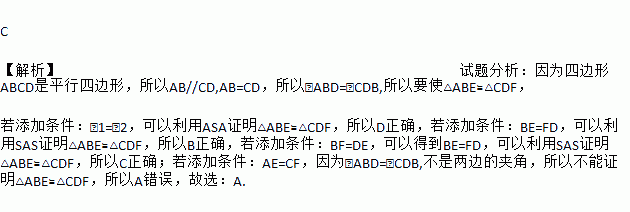 A. AE=CF B. BE=FD C. BF=DE D. ∠1=∠2