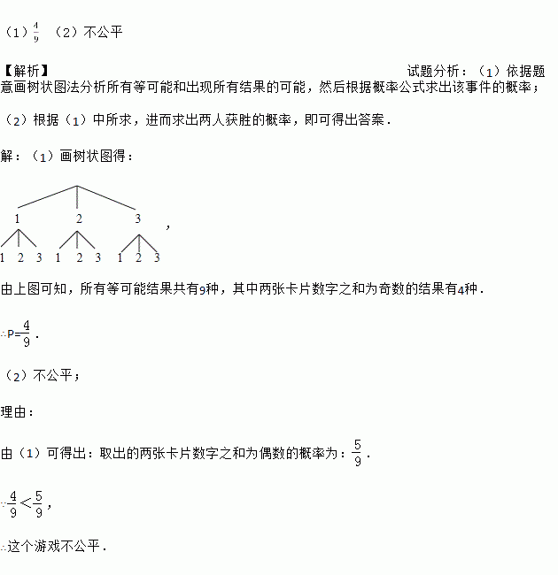 (2)若取出的两张卡片数字之和为奇数,则甲胜;取出的两张卡片数字之和为偶数,则乙胜;试分析这个游戏是否公平?请说明理由.