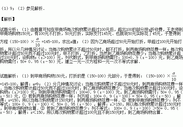 折收费;在乙商场每次购物累计超过50元后,超过50元的部分按95%收费,若王老师有次到甲商场购物150元,实际支付145元.