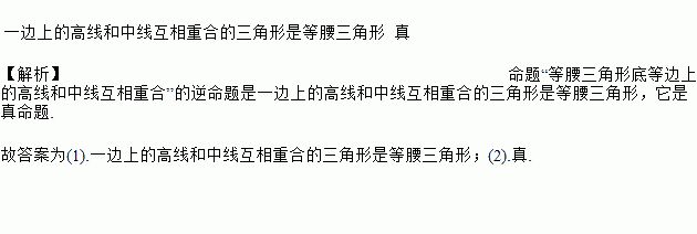一边上的高线和中线互相重合的三角形是等腰三角形 真 【解析】命题“等腰三角形底等边上的高线和中线互相重合”的逆命题是一边上的高线和中线互相重合的三角形是等腰三角形,它是真命题. 故答案为(1).一边上的高线和中线互相重合的三角形是等腰三角形;(2).真.