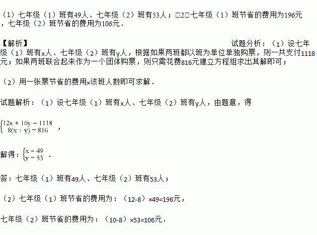 某校七年级(1)、(2)两班计划去游览该景点,其中(1)班人数少于50人,(2)班人数多于50人且少于100人,如果两班都以班为单位单独购票,则一共支付1118元;如果两班联合起来作为一个团体购票,则只需花费816元.