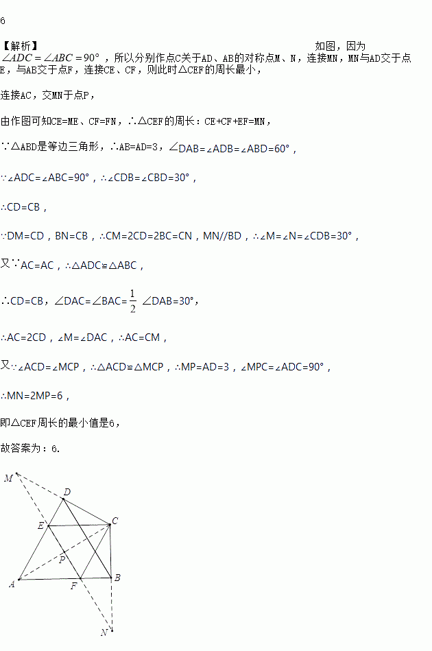 如图,△ABD是边长为3的等边三角形,E,F分别是边AD,AB上的动点,若∠ADC=∠ABC=90°,则△CEF周长的最小值为______.
