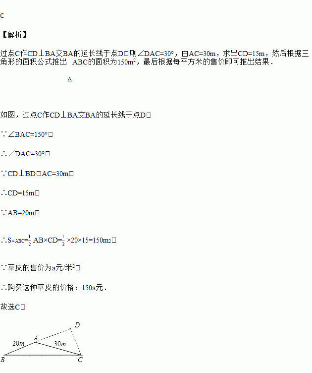 如图,一块三角形空地上种草皮绿化,已知AB=20米,AC=30米,∠A=150°,草皮的售价为a元/米2,则购买草皮至少需要( )
