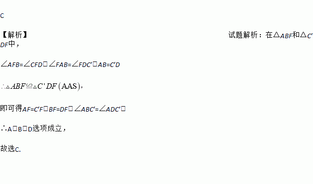 C 【解析】试题解析:在△ABF和△C′DF中, ∠AFB=∠CFD,∠FAB=∠FDC′,AB=C′D 即可得AF=C′F,BF=DF,∠ABC′=∠ADC′, ∴A,B,D选项成立, 故选C.