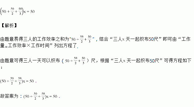 《数》是中国数学史上的重要著作,比我们熟知的汉代《九章算术》还要古老,保存了许多古代算法的最早例证(比如“勾股”概念),改变了我们对周秦数学发展水平的认识.文中记载“有妇三人,长者一日织五十尺,中者二日织五十尺,少者三日织五十尺,今威有功五十尺,问各受几何?”译文:“三位女人善织布,姥姥1天织布50尺,妈妈2天织布50尺,妞妞3天织布50尺.如今三人齐上阵,共同完成50尺织布任务,请问每人织布几尺?”设三人一共用了x天完成织布任务,则可列方程为________________.