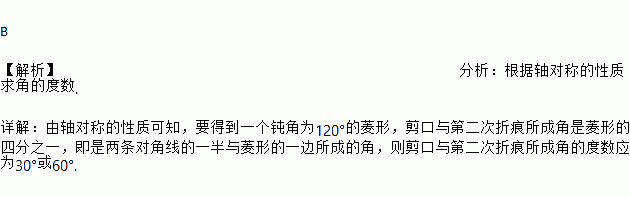 如图,把一个长方形的纸片按图示对折两次,然后剪下一部分,为了得到一个钝角为120°的菱形,剪口与第二次折痕所成角的度数应为 ( )
