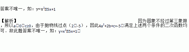 答案不唯一,如:y=x2﹣5x+1 【解析】因为图象不经过第三象限,所以a>0,c≥0,由于抛物线过点(2,-5),因此4a2+2b+c=-5;满足上述两个条件的二次函数均可.故此题答案不唯一,如:y=x2﹣5x+1.