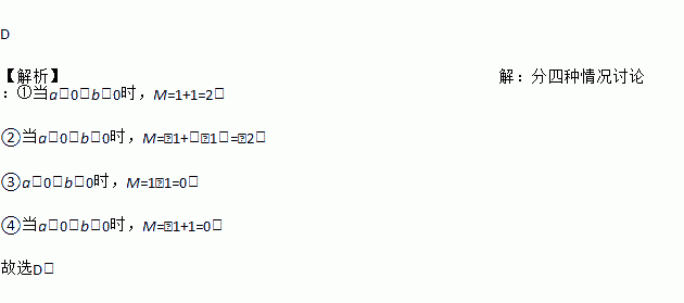 D 【解析】【解析】 分四种情况讨论:①当a>0,b>0时,M=1+1=2; ②当a<0,b<0时,M=﹣1+(﹣1)=﹣2; ③a>0,b<0时,M=1﹣1=0; ④当a<0,b>0时,M=﹣1+1=0. 故选D.