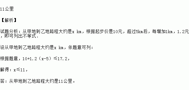 某城市一种出租汽车起步价是10元行驶路程在5km以内都需10元车费),达到或超过5km后,每增加1km,1.2元(不足1km,加价1.2元;不足1km部分按1km计)。现在某人乘这种出租车从甲地到乙地,支付17.2元,则从甲地到乙地路程大约是多少?
