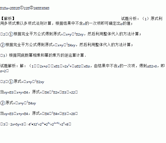 (1)a=2;(2)①22;②28;(3)8. 【解析】试题分析:(1)原式利用多项式乘以多项式法则计算,根据结果中不含x的一次项即可确定出a的值; (2)①根据完全平方公式得到原式=(x+y)2﹣2xy,然后利用整体代入的方法计算; ②根据完全平方公式得到原式=(x+y)2﹣4xy,然后利用整体代入的方法计算; (3)根据同底数幂相乘和幂的乘方的逆运算计算. 试题解...