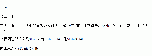 平行四边形的底是n,高是h,它的面积S=_____,若n=b,h=4,则S=_____;