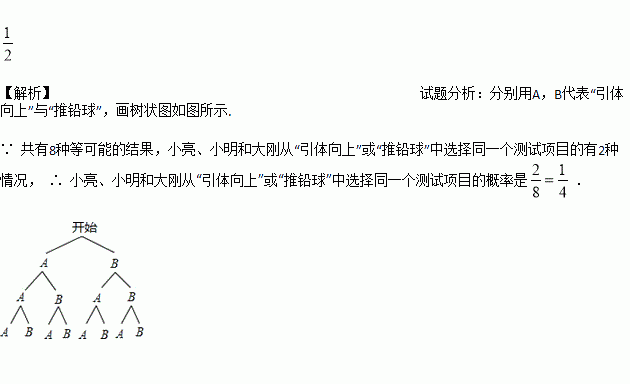 我市初中毕业男生体育测试项目有四项,其中“立定跳远”“1000米跑”“肺活量测试”为必测项目,另一项“引体向上”或“推铅球”中选一项测试.小亮、小明和大刚从“引体向上”或“推铅球”中选择同一个测试项目的概率是___.