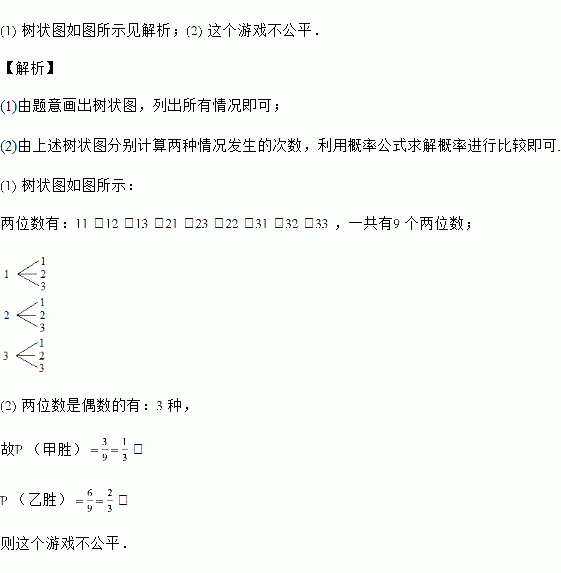 甲、乙两人做游戏,约定得到的两位数是偶数时甲胜,否则乙胜,这个游戏公平吗?请说明理由.![]()