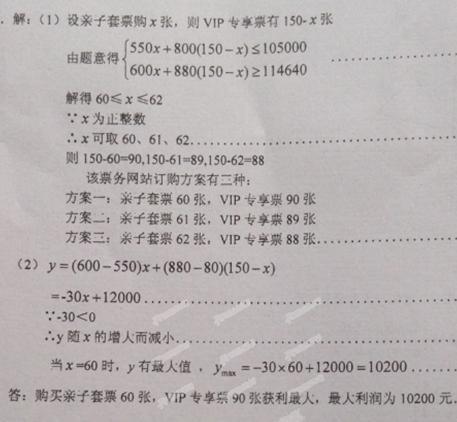 古巴国家芭蕾舞团作为世界芭蕾舞团之一,将于2015年携亚洲巡演版特别纪念版《天鹅湖》首次到访山城,届时,重庆市民将领略“世界第一黑天鹅”的迷人风采.某票务网站抢得商机拿到了亲子套票和VIP专享票的销售权.但由于票价较高,该票务网站准备用不超过105000元购进这两种票共150张票,其中亲子套票每张订购价550元,VIP专享票每张订购价800元,亲子套票每张票价600元,VIP专享票每张票价880元,预计销售额不低于114640元.设亲子套票购进