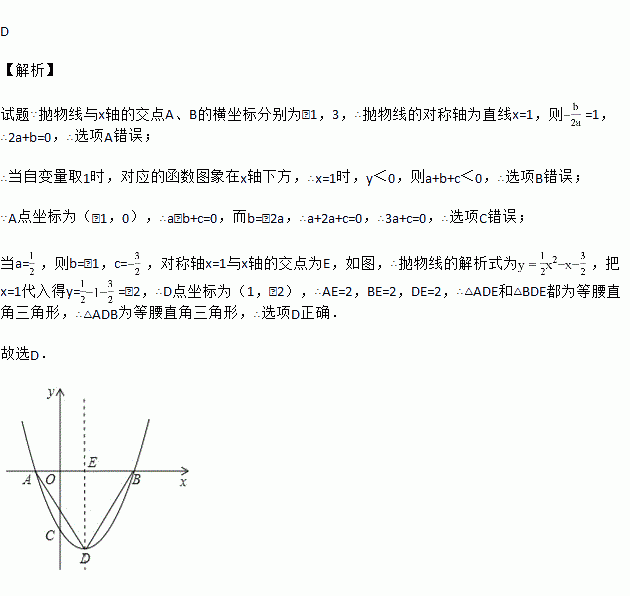 如图,二次函数y=ax2+bx+c(a>0)图象的顶点为D,其图象与x轴的交点A,B的横坐标分别为-1和3,则下列结论正确的是( )