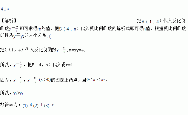 (x>0)的图像交于A(1,4),B(4,n)两点,与x轴、y轴分别交于C,D两点,则m=________,n=________;若M(x1,y1),N(x2,y2)是反比例函数y=