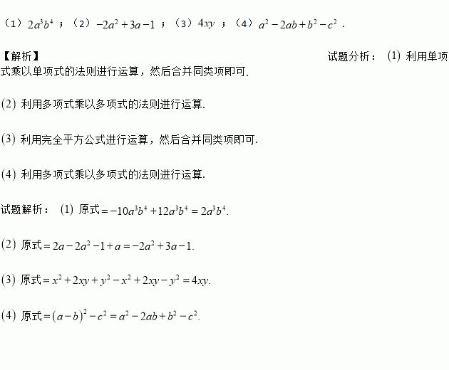 (1)5a2b·(-2ab3)+3ab·(4a2b3); (2)(2a-1)(1-a);