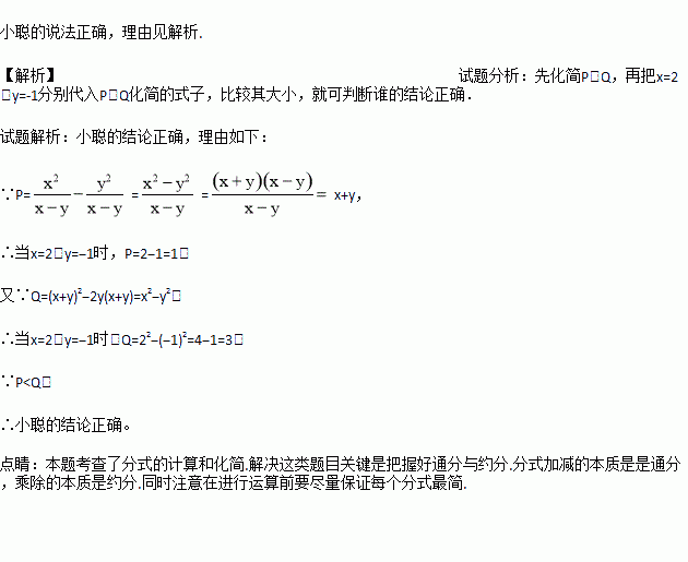 ,小敏、小聪两人在x=2,y=-1的条件下分别计算了P和Q的值, 小敏说P的值比Q大, 小聪说Q的值比P大.请你判断谁的结论正确,并说明理由.