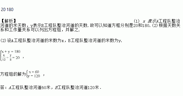 ⑵如果乙同学直接设A工程队整治河道的米数为x,B工程队整治河道的米数为y,列出了一个方程组,求A、B两工程队分别整治河道多少米.请你帮助他写出完整的解答过程。
