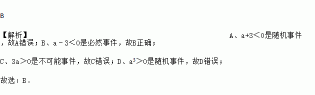 B 【解析】A、a+3<0是随机事件,故A错误;B、a﹣3<0是必然事件,故B正确; C、3a>0是不可能事件,故C错误;D、a3>0是随机事件,故D错误; 故选:B.
