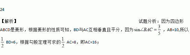 如图,菱形ABCD的边长为15,sin∠BAC=,则对角线AC的长为____.