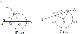 (2)首先过点O作OH⊥AB于点H,由射线BA绕点B按顺时针方向旋转60°时与⊙O相交于M、N两点,即可得∠ABC=30°,继而求得OH的长,然后由特殊角的三角函数值,求得∠MOH的度数,继而求得∠MON的度数,然后由弧长公式求得