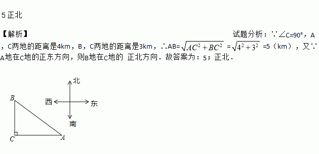 已知A,B,C三地位置如图所示,∠C=90°,A,C两地的距离是4 km,B,C两地的距离是3 km,则A,B两地的距离是_________km;若A地在C地的正东方向,则B地在C地的_____方向.