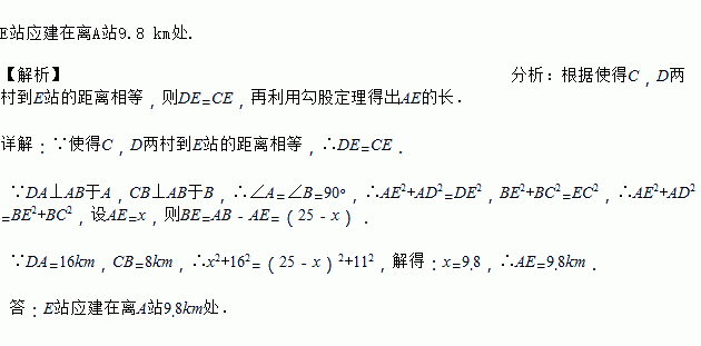如图,铁路上A,B两点相距25 km,C,D为两村庄,DA⊥AB于点A,CB⊥AB于点B,已知DA=16 km,CB=11 km,现在要在铁路AB上建一个土特产品收购站E,使得C,D两村到E站的距离相等,则E站应建在离A站多少km处?