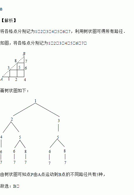 如图是一个沿3×3正方形方格纸的对角线AB剪下的图形,一质点P由A点出发,沿格点线每次向右或向上运动1个单位长度,则点P由A点运动到B点的不同路径共有( )