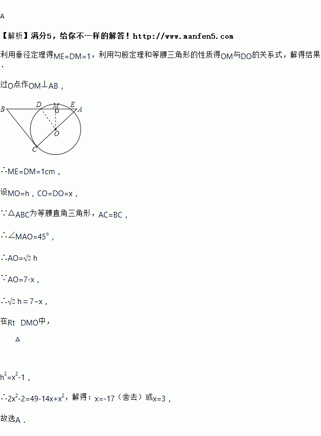 如图,将一块等腰的直角顶点放在上,绕点旋转三角形,使边经过圆心,某一时刻,斜边在上截得的线段,且,则的长为( )