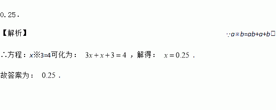 0.25. 【解析】∵a※b=ab+a+b, ∴方程:x※3=4可化为: ,解得: . 故答案为: .