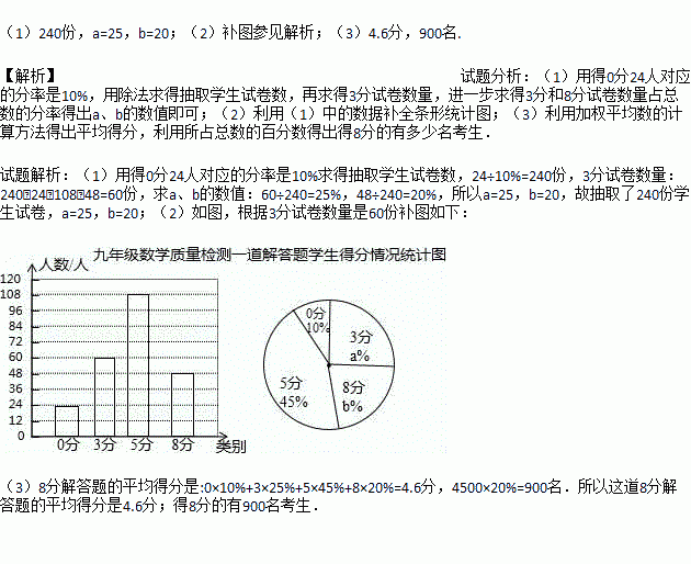 某地区在一次九年级数学质量检测试题中,有一道分值为8分的解答题,所有考生的得分只有四种,即:0分,3分,5分,8分,老师为了解本题学生得分情况,从全区4500名考生试卷中随机抽取一部分,分析、整理本题学生得分情况并绘制了如下两幅不完整的统计图: