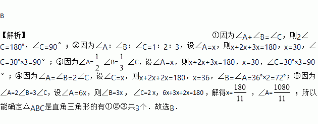 在下列条件中,①∠A+∠B=∠C; ②∠A:∠B:∠C=1:2:3; ③∠A=