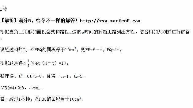 如图所示,在△ABC中,∠B=90°,BC=8cm,AB=6cm.点P从点A开始沿AB边向点B以1cm ∕s的速度移动,点Q从点B开始沿BC边向点C以4 cm ∕ s的速度移动.如果点P、Q分别从点A、B同时出发,经过几秒钟,△PBQ的面积等于10cm2?