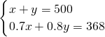 “五•一”期间,某商场搞优惠活动.由顾客抽奖决定折扣,某顾客购买甲、乙两种商品,分别抽到七折和八折,共付368元,这两种商品原价之和为500元,问两种商品原价各是多少元?