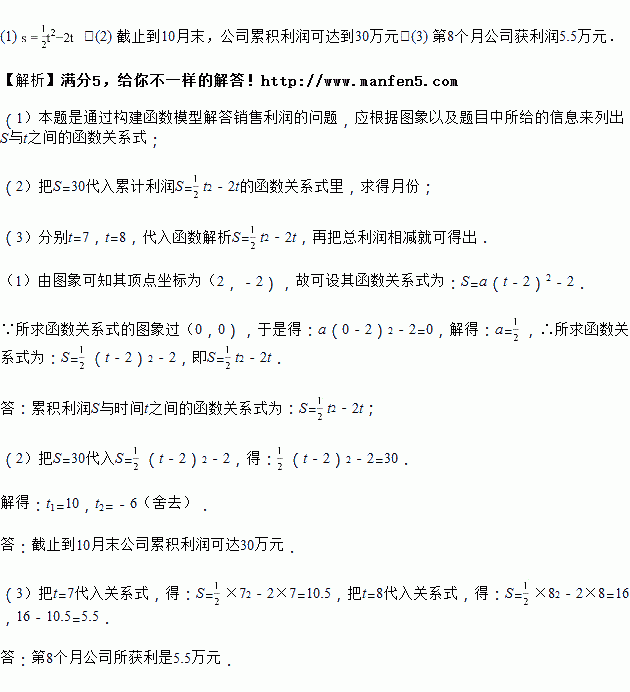 (1)由已知图象上的三点坐标,求累积利润s(万元)与时间t(月)之间的函数关系式;