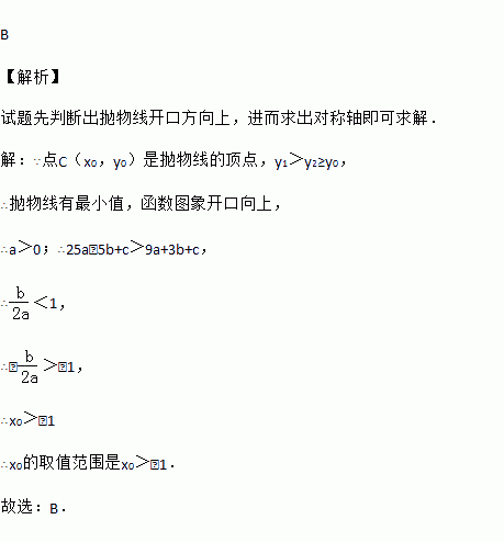 已知两点A(﹣5,y1),B(3,y2)均在抛物线y=ax2+bx+c(a≠0)上,点C(x0,y0)是该抛物线的顶点.若y1>y2≥y0,则x0的取值范围是( )
