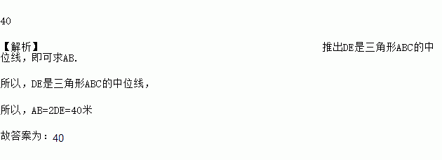 如图,A、B两点被池塘隔开,在AB外选一点C,连接AC、BC,取AC、BC的中点D、E,量出DE=20米,则AB的长为___________米.