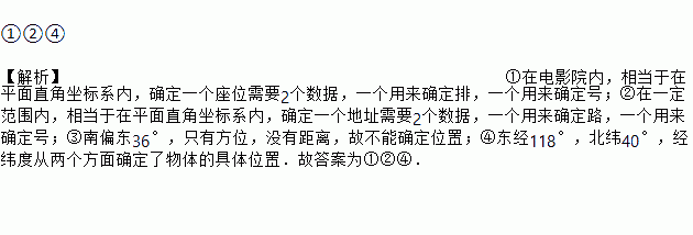 下列语句:①11排6号;②解放路112号;③南偏东36°;④东经118°,北纬40°.其中能确定物体具体位置的是__________(填序号).