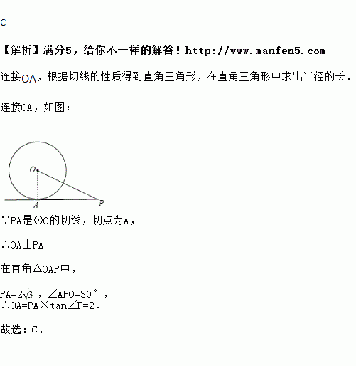 如图所示,PA是⊙O的切线,切点为A,PA=2,∠APO=30°,则⊙O的半径为( )
