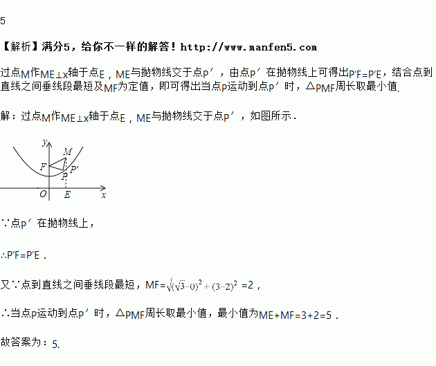 己知抛物线具有如下性质:该抛物线上任意一点到定点F(0,2)的距离与到轴的距离始终相等,如图,点M的坐标为,P是抛物线上一个动点,则△PMF周长的最小值是__________.