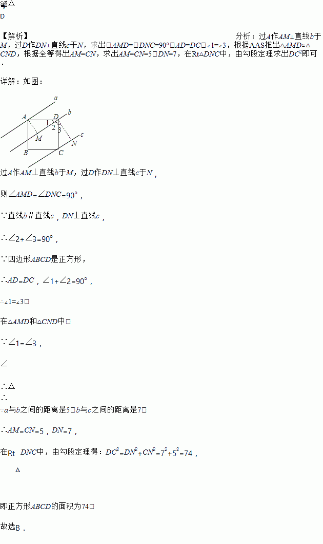 如图,四边形ABCD是正方形,直线,,分别通过A,B,C三点,且,若与的距离为5,与的距离为7,则正方形ABCD的面积等于( )