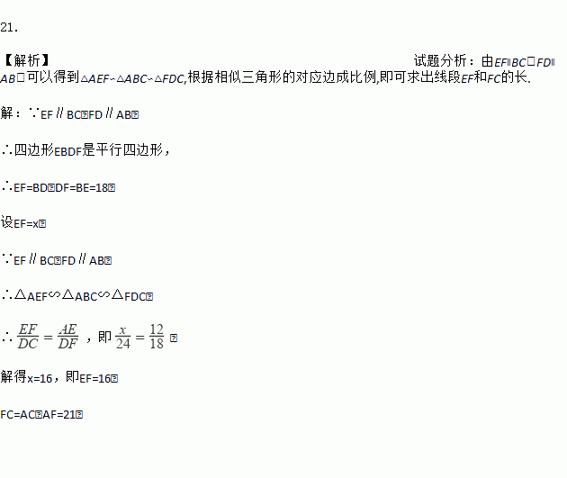 如图,△ABC中,EF∥BC,FD∥AB,AE=12,BE=18,AF=14,CD=24,求线段FC,EF的长.