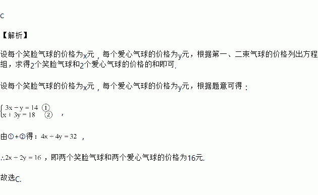 陈老师打算购买气球装扮学校“六一”儿童节活动会场,气球的种类有笑脸和爱心两种,两种气球的价格不同,但同一种气球的价格相同,由于会场布置需要,购买时以一束(4个气球)为单位,已知第一、二束气球的价格如图(1)(2)所示,则第三束气球(如图所示)的价格为( )