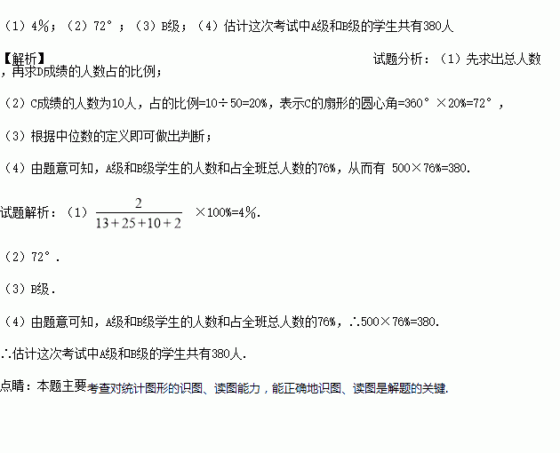 (4)若该校九年级学生共有500人,请你估计这次考试中A级和B级的学生共有多少人?
