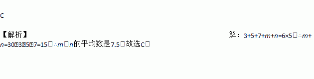 C 【解析】【解析】 3+5+7+m+n=6×5,∴m+n=30﹣3﹣5﹣7=15,∴m,n的平均数是7.5.故选C.