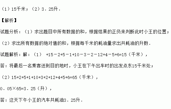 (1)15千米;(2)3.25升. 【解析】 试题分析:(1)求出题目中所有数据的和,根据结果的正负来判断此时小王的位置; (2)求出所有数据的绝对值的和,根据每千米的耗油量求出共耗油的升数. 试题解析:【解析】 (1) +15-2+5-1+10-3-2-12+4-5+6=15(千米), 答:将最后一名乘客送到目的地时,小王在下午出车时的出发点东15千米处; ...